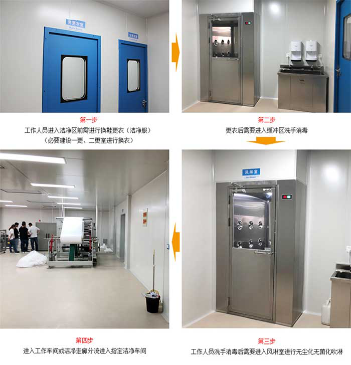 2. 人员方面:从更衣 >> 洗手消毒/缓冲 >> 风淋消毒 >> 洁净走廊 >> 各个洁净车间都必须无尘化。